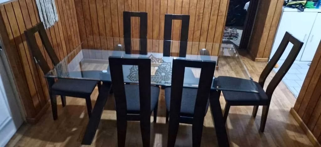 Mesa con cubierta de vidrio, 6 sillas retapizadas