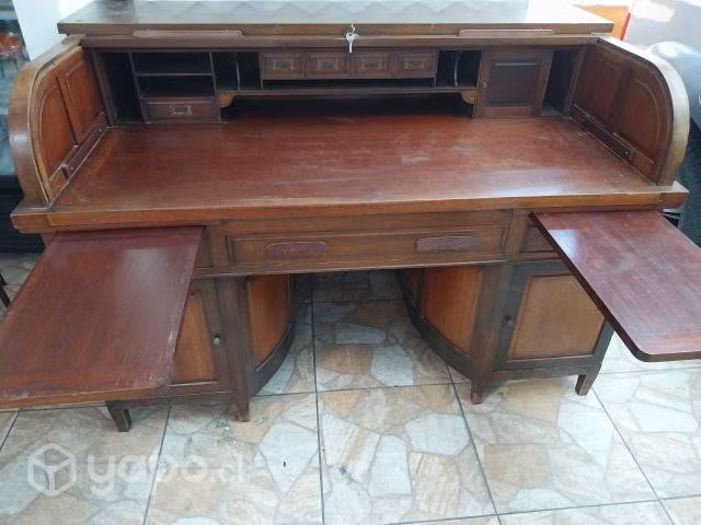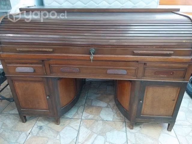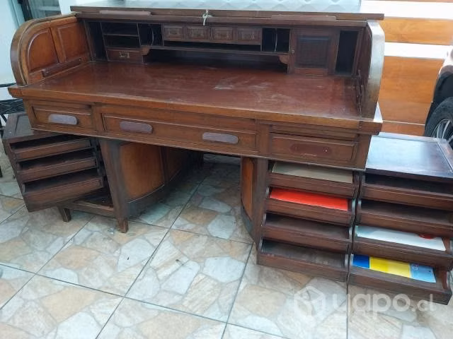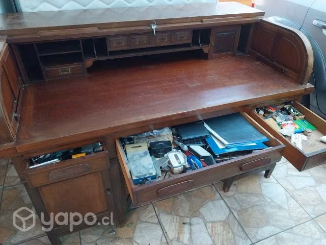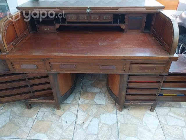 Solo para interesados y anticuarios. Escritorio de cortina de madera de roble del año 1930. Cuenta con 4 cajones pequeños y un cajon con llave en la parte superior y en la parte inferior tiene 3 cajones centrales, 2 tablas ocultas y dos cajones laterales los cuales cuentan con 8 compartimientos en cada lado como se muestra en las fotos. Consultar precio al número de contacto.