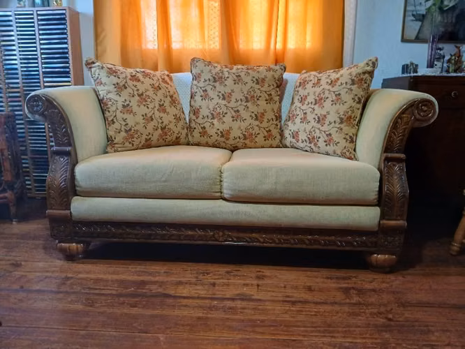Vendo sofá antiguo 2 cuerpos, 3 cojines, madera torneada en buenas condiciones.