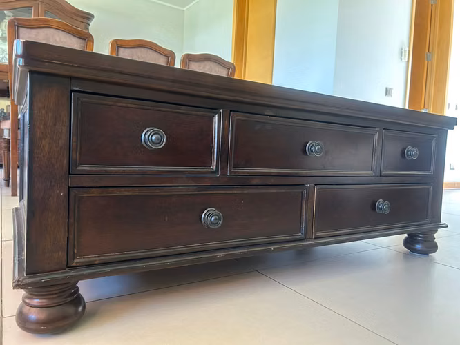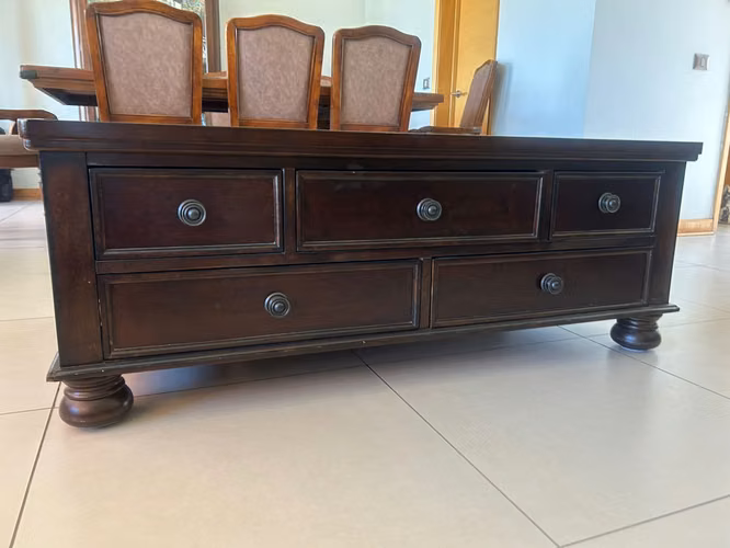 Medidas 1.20 ancho, 2.00 largo, mas extension de 60 cm. Vitrina alto 1.95, ancho 1.14, fondo 40. Mesa centro largo 1,32 ancho 71. Arrimo, largo 1,31 ancho 51