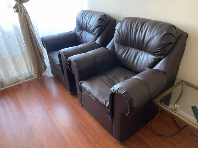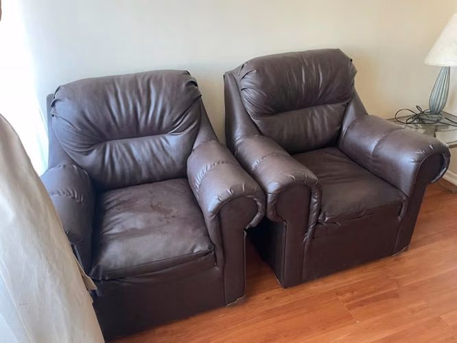 Sillones tipo cuero color café oscuro, en excelente estado. Por renovación