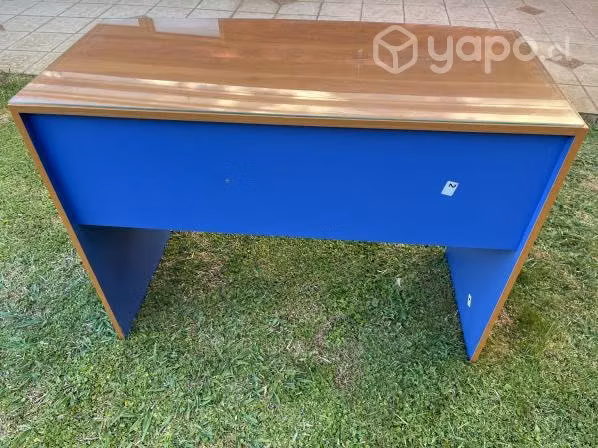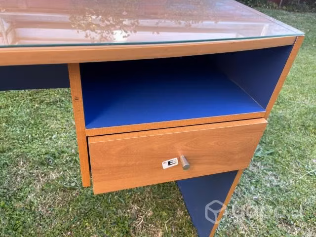 excelente escritorio con poquísimo uso y excelente estado, construido en melamina bicolor (azul y café madera) con vidrio biselado para protección de su cubierta y cajón para pertenencias, documentos o cuadernos, medidas Alto: 74 cms. Ancho 43 cms. y largo 100 cms. Pago solo en efectivo.