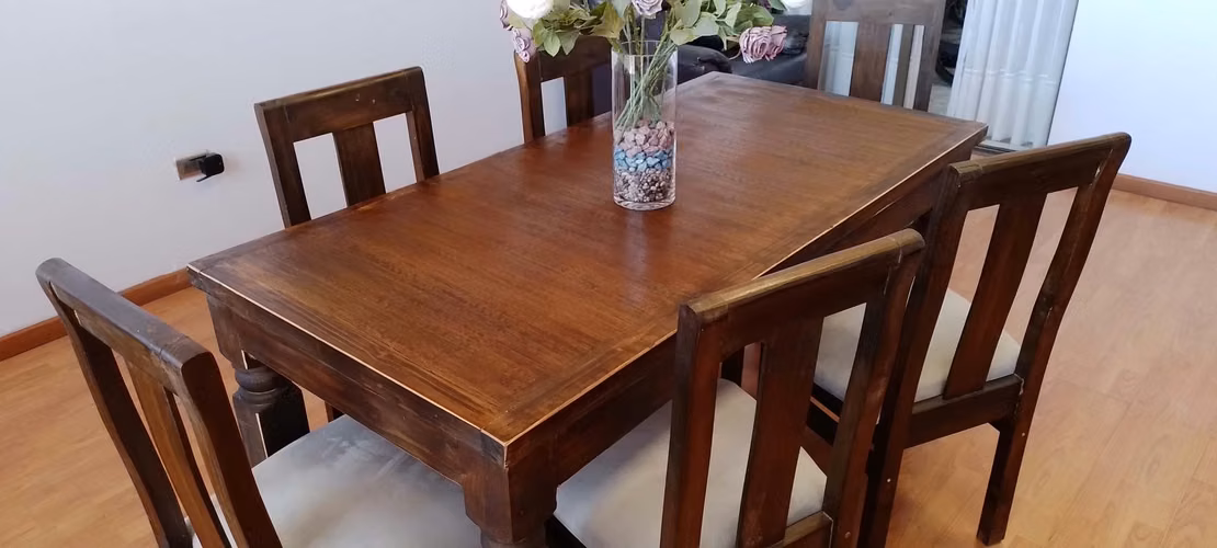 mesa comedor rustica con 6 sillas tapizadas genero gris