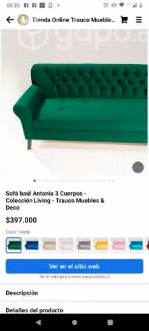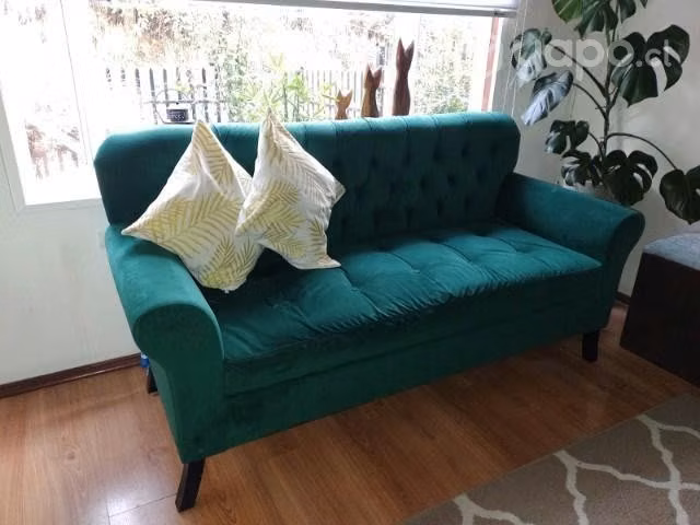 Sofa estilo capiton color verde, con baúl para guardar accesorios, en buenas condiciones como se ven las fotos. En la última imagen precio referencial de tienda.