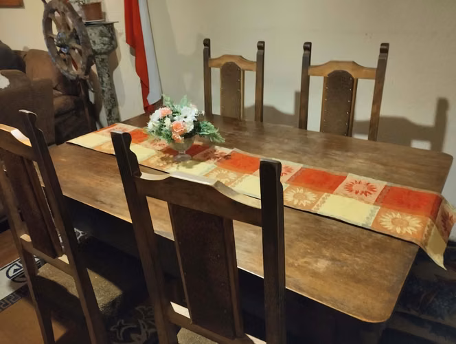 Mesa madera Mañío de 1,50 x 95 cms. Y 06 sillas de Madera , todo en buen