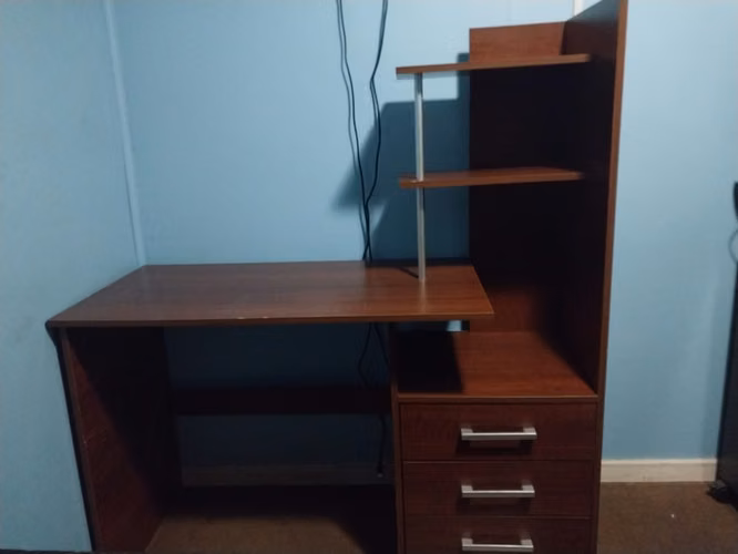 Escritorio en buen estado para todo tipo de usos, cuenta con 3 cajones grandes y 2 repisas en la parte superior, tambien con un espacio debajo de las repisas