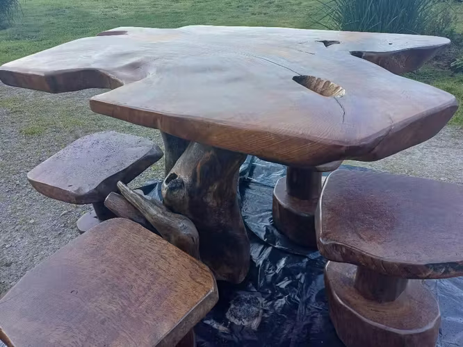4 asientos incluidos/ Pieza única / 4 puestos / Una escultura para en raíces de Alerce