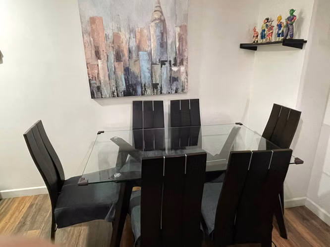 Vendo comedor con 6 sillas en muy buenas condiciones, el único detalle es que una de las sillas tiene trizada la madera donde uno se apoya(No las patas ni la estructura) lo cual es fácil de reemplazar, vendo por espacio.