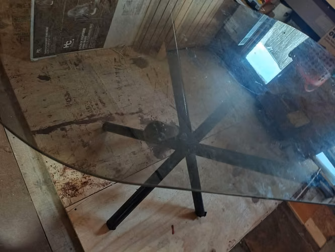 mesa de comedor de vidrio ovalada 1cm de gruesor con patas de fierro. no tiene sillas