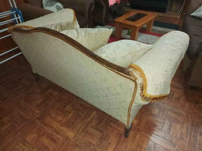 - ÑuñoaSillón loveseat clásico con tapizado mixto y detalles en madera tallada