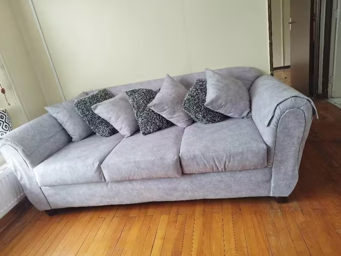 Sofá 3 cuerpos gris usado y recién tapizado. en perfectas condiciones. Vendo por renovación de ambiente. Incluye todos los cojines de la foto.