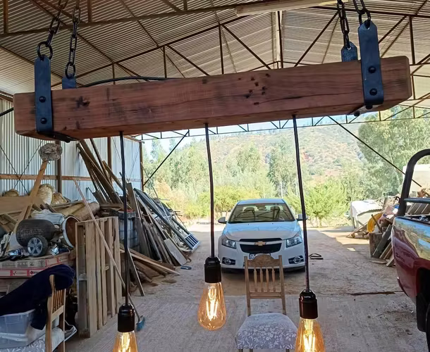 Lámpara de Roble y Fierro de fabricación propia con madera de demolición y fierro con cuelga de cadena lista para instalar y conectar a la energía. Medidas 86cm. largo 14cm. ancho y 110cm. altura total incluidos cables y ampolletas.