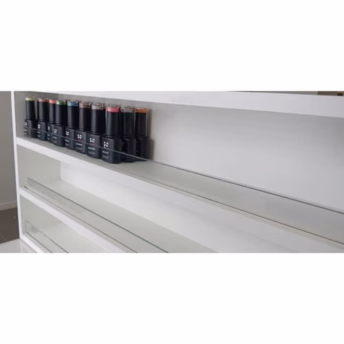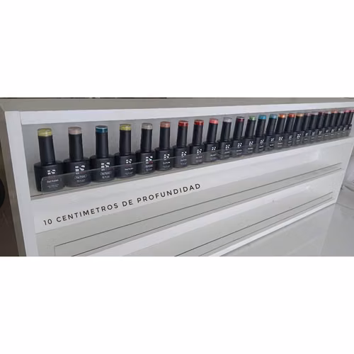 Vendo repisa exhibidora de productos, cuenta con soporte de vidrio Medidas: 1 metro de largo, 36 cm de alto y 10 cm de profundidad Fue utilizado como exhibidor de esmaltes: Capacidad mínima de 75 esmaltes y máxima de 225 esmaltes