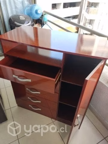 Comoda 5 cajones y puerta lateral con 2 repisas color caoba.