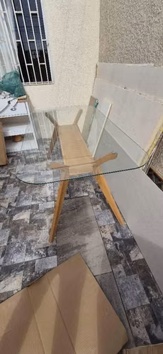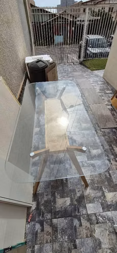 - CoyhaiqueMesa con cubierta de vidrio y soporte madera de lenga con 6 sillas.