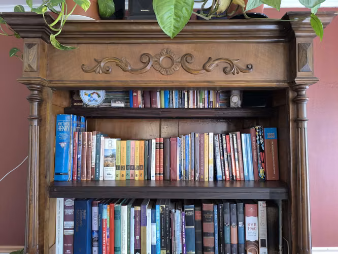 Librero antiguo de roble con 5 estantes.