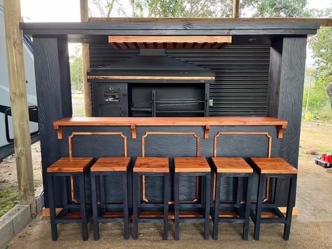 Se vende bar de madera , tiene 3 metros de largo x 2.15 de alto , incluye coopero para (60 copas aprox) dos vitrinas laterales en cada pilar , cavas en la parte inferior de cada pilar , 6 taburetes solidos en dos pulgadas , luz led en la parte superior , totalmente nuevo , soy fabricante