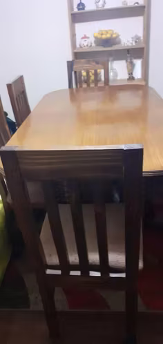 vendo comedor de madera color nogal con mesa extensión con 6 sillas de tapiz color rosado, con capacidad para 12 personas, en muy buen estado.