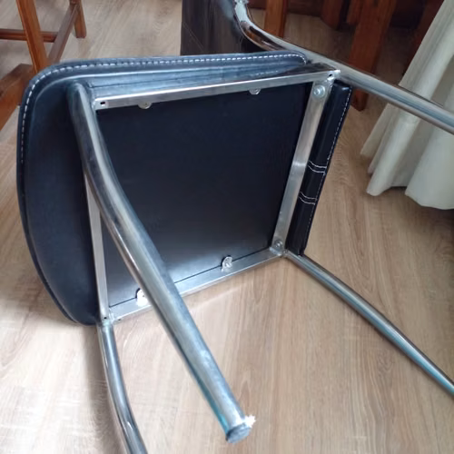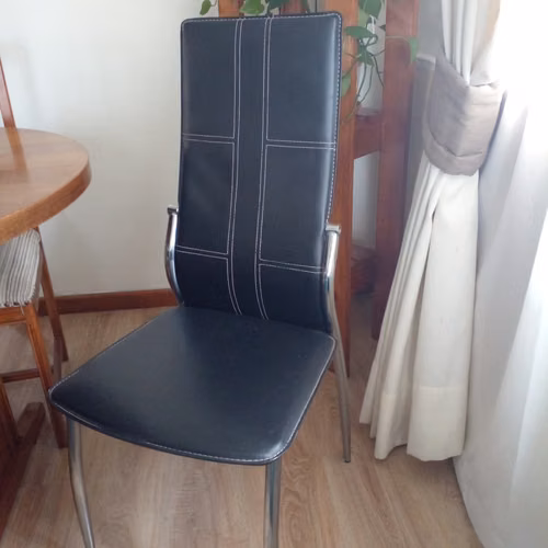 Vendo por viaje , moderno comedor con cubierta de vidrio templado , biselado y extensible para 10 personas. Incluye sus 6 sillas cromadas y tapizadas en cuero negro.