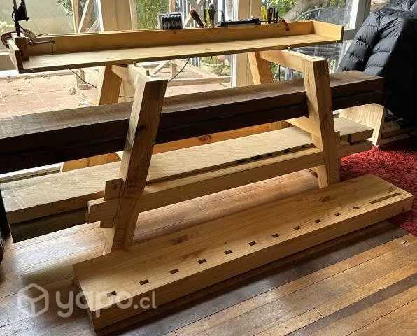Usada por 2 años, hecha en madera solida pino radiata nacional, el mesón cuenta con ranura para instalación de tornillo y espacios para topes de apriete.