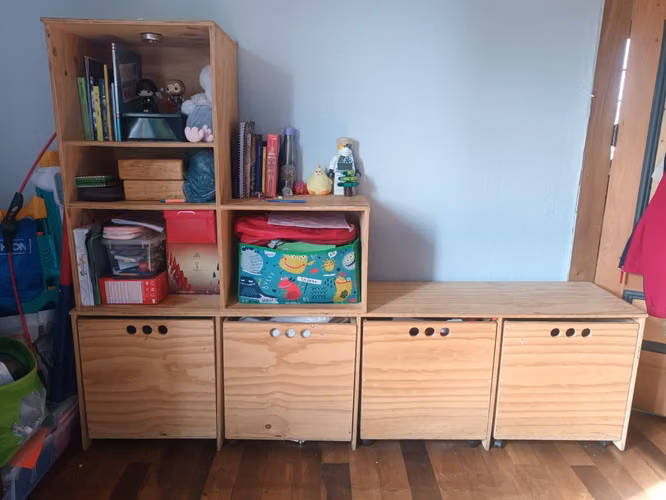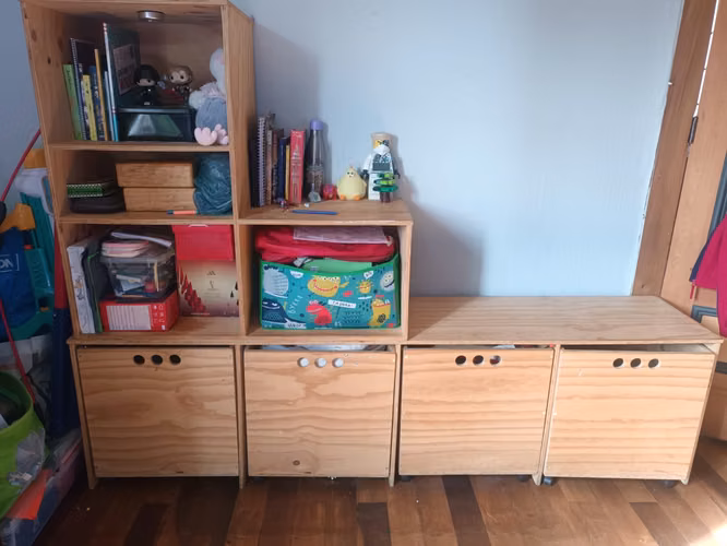 Se vende mueble en perfectas condiciones, es un mueble con 4 cajoneras de madera robusta (no melamina) con ruedas y tienen sacados para que los niños los puedan mover con facilidad. Además, tiene una repisa, la cual se puede poner sobre el mueble a cualquiera de sus dos lados o bien de manera independiente en otro espacio, esta también es de madera robusta.