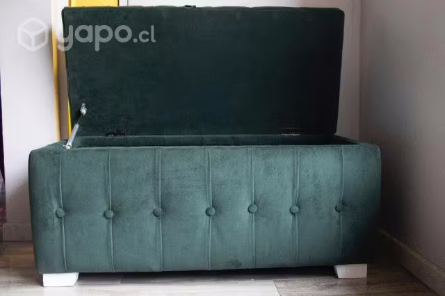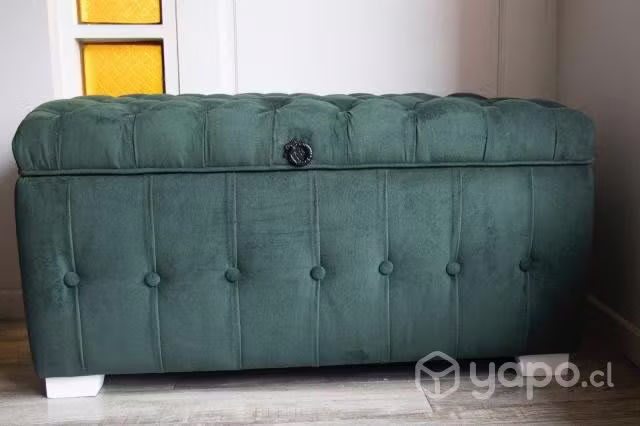 Se vende Banquetas Baúl con espuma de alta densidad en estilo capitoné en tela felpa verde botella y patas de madera. Las dimensiones son las siguientes: