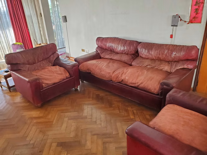 Vendo juego de living de cuero completo, compuesto por un sofá de 3 cuerpos más 2 sofás individuales, en buen estado.
