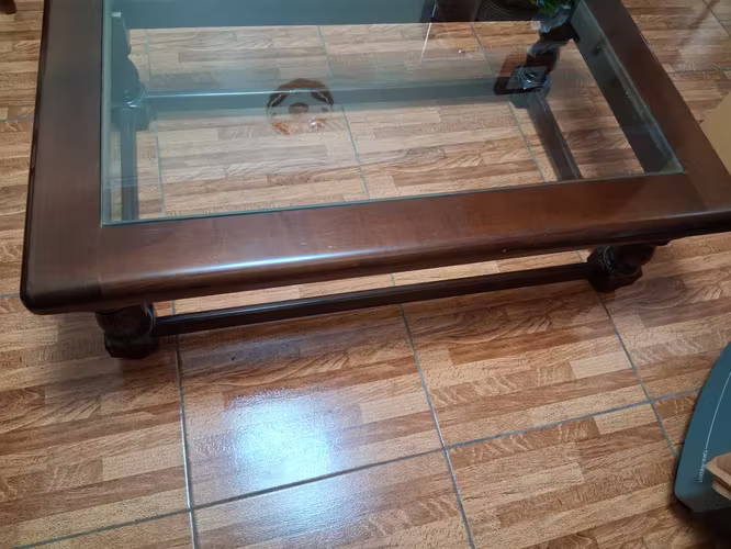 Hermosa mesa de centro de material de caoba con cubierta de vidrio, elegante y firme. Ideal para el living o sala de estar.
