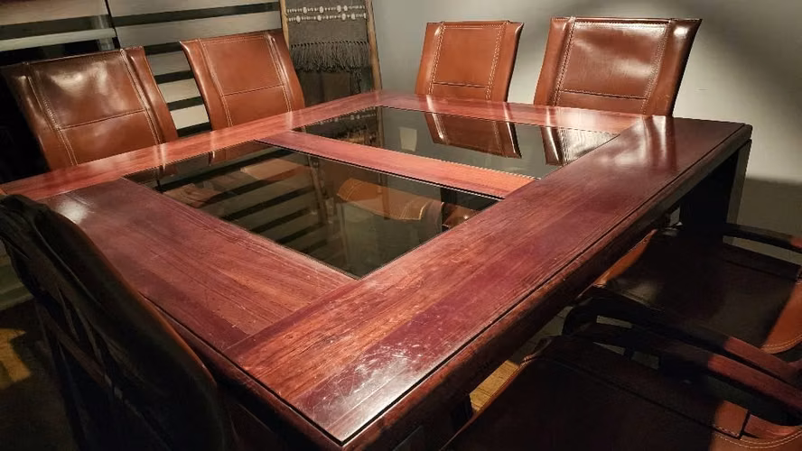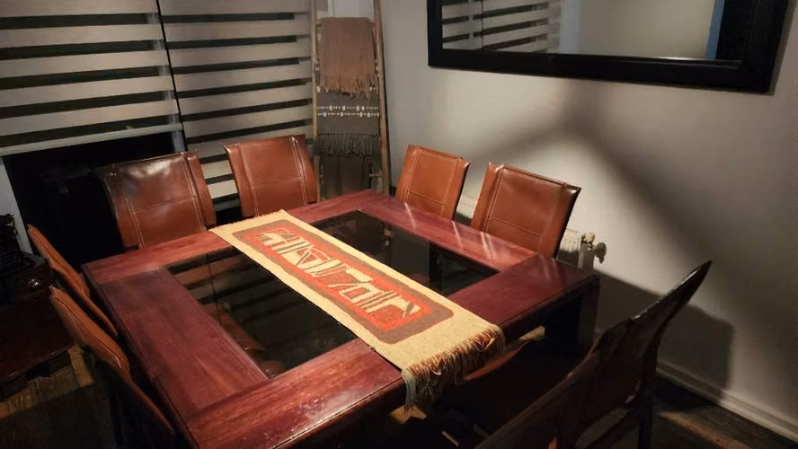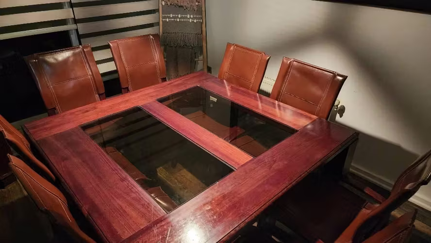 Comedor cuadrado, mesa de 1,40 mts., con vidrio en el centro, 8 sillas de cuero y madera.