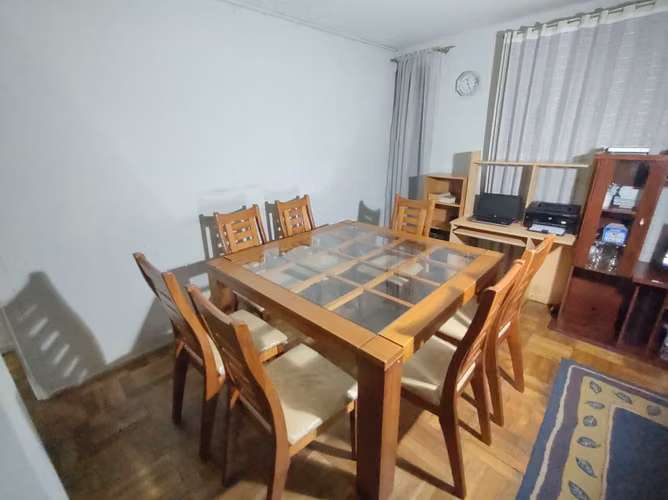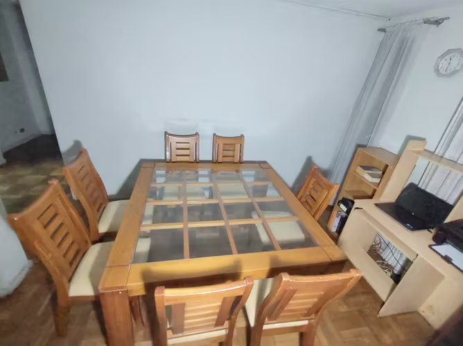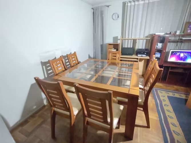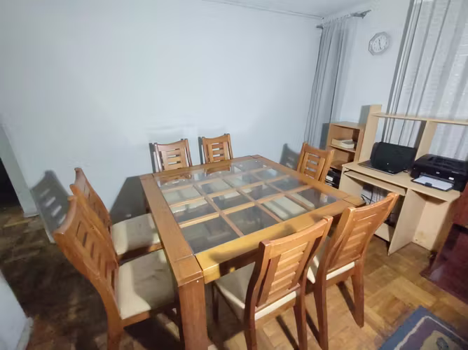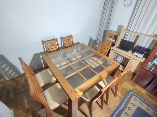 Vendo hermoso comedor cuadrado de madera de 7 sillas con cubierta de vidrio en 360 mil pesos.