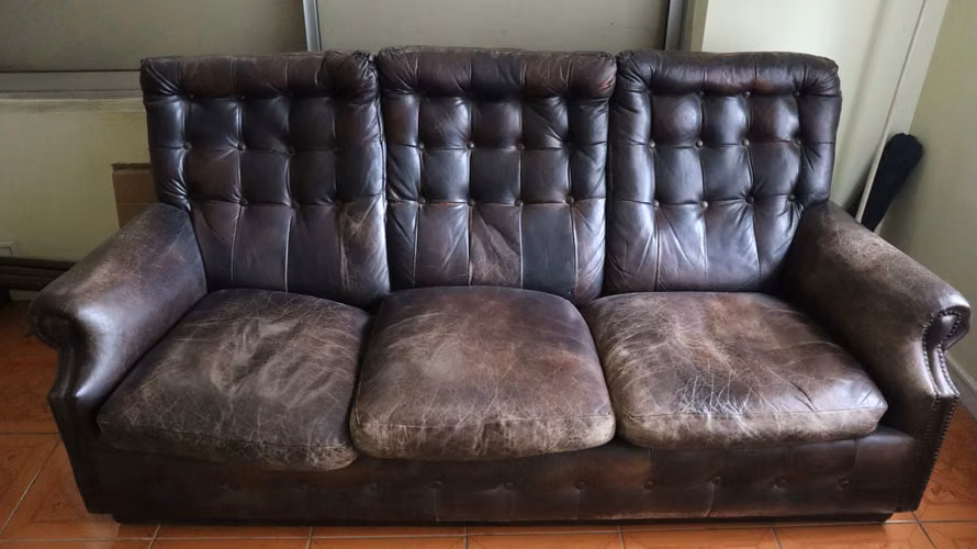 Juego completo de living. Sofa de cuero 3 cuerpos, pequeños detalles. Dos sillones individuales de cuero.
