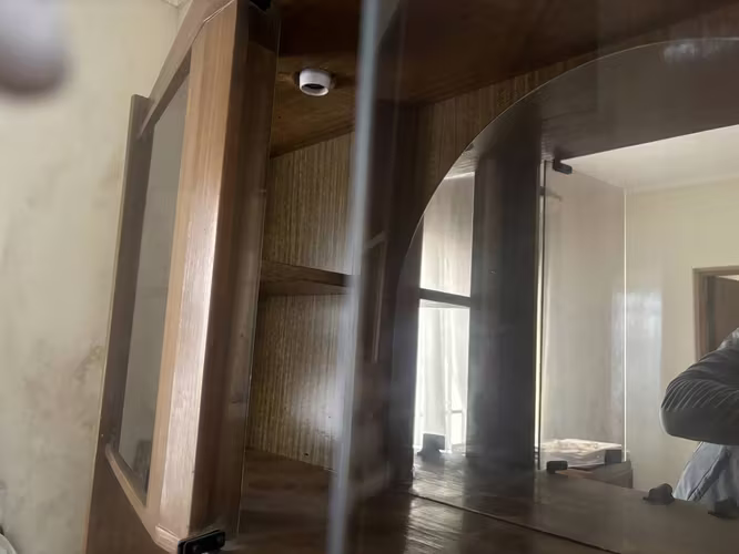 Estantería con 3 cajones, 2 puertas y repisa con puertas vidrios, además al medio tiene un espejo.
