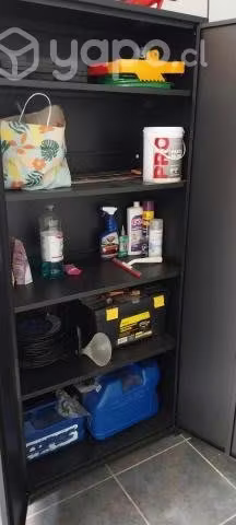 Estupendo armario metálico de color negro con baldas de altura ajustables, perfecto para ordenar enseres de logia, jardín y herramientas. Seminuevo menos de 1 año. Medidas 85cm de largo, 1,90m de alto y 40cm de profundidad app.