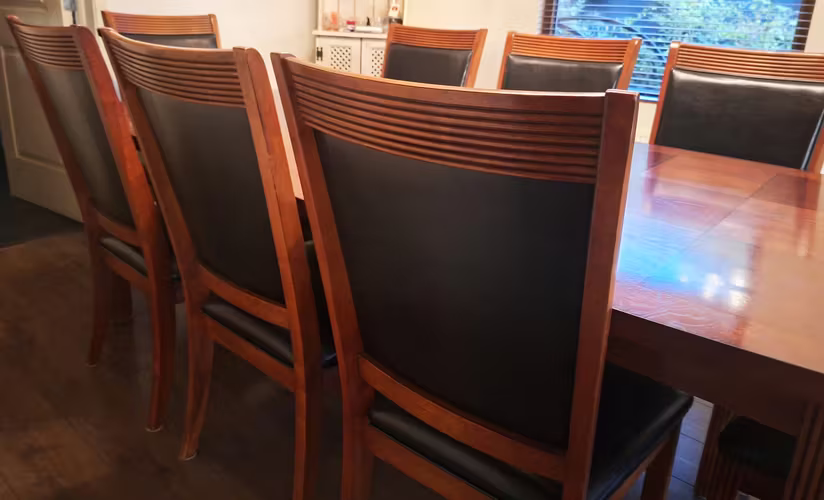 - Ocho sillas de respaldo alto, fabricadas en madera, con asiento y respaldo tapizados en negro para mayor comodidad y sofisticación.
