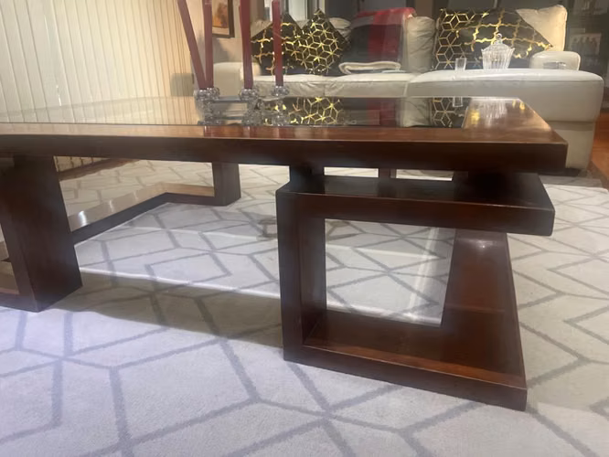 Mesa de centro de madera sólida. Cubierta de vidrio, esta quebrado en una esquina muy pequeño.