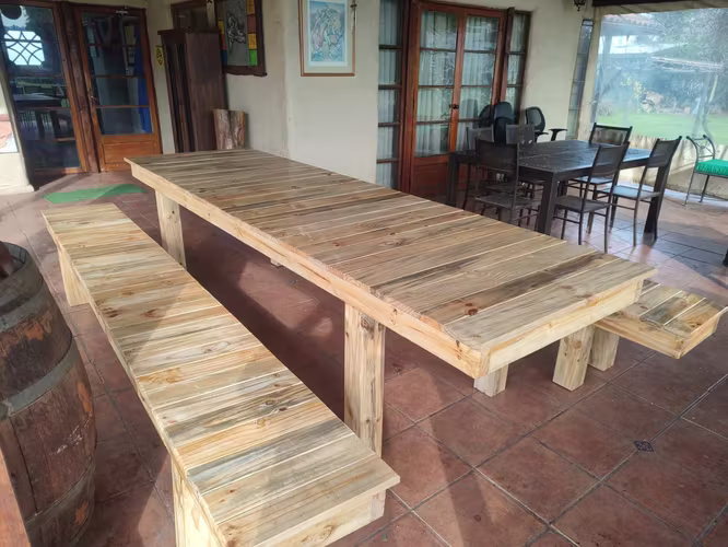 Preciosa mesa de madera de 3.20 mts de largo con bancas. Preciosa para terraza casa jardin.