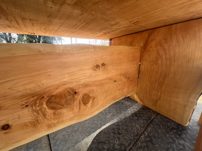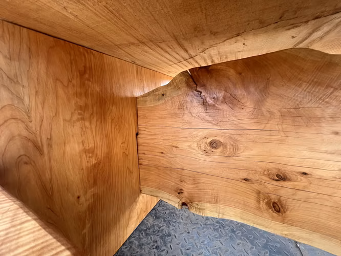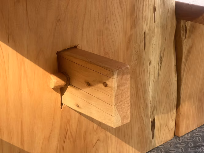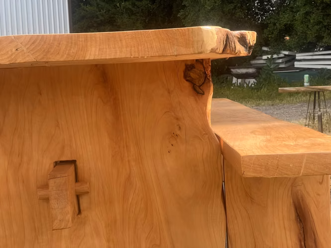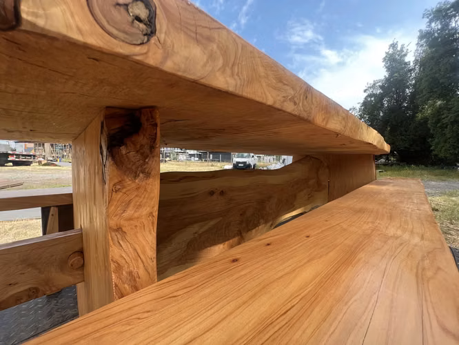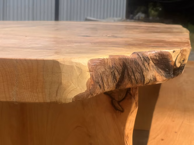 La mesa está hecha de madera 100% Ciprés Macrocarpa, madera nativa. Con su cubierta talada y esculpida directamente desde el tronco, es decir de una sola pieza, con un diámetro de al menos un metro. Mientras más ancho es el diámetro del tronco más longevo es el árbol y por lo mismo más ancho puede ser la cubierta de la mesa.