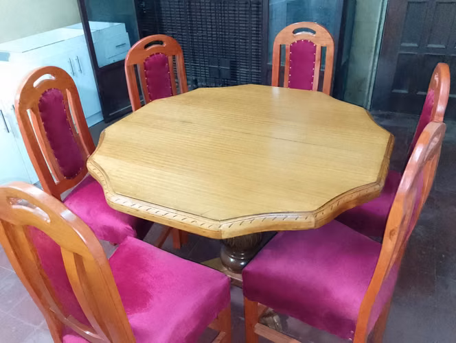 -Juego de 6 sillas coigüe respaldo tapizado felpa color granate.