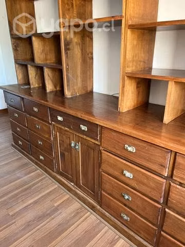 Preciosa estantería de madera maciza, ancho maximo 260 cm, profundidad parte inferior 60 cm, profundidad repisas 35 cm. Impecable, esta desarmada lista para entrega