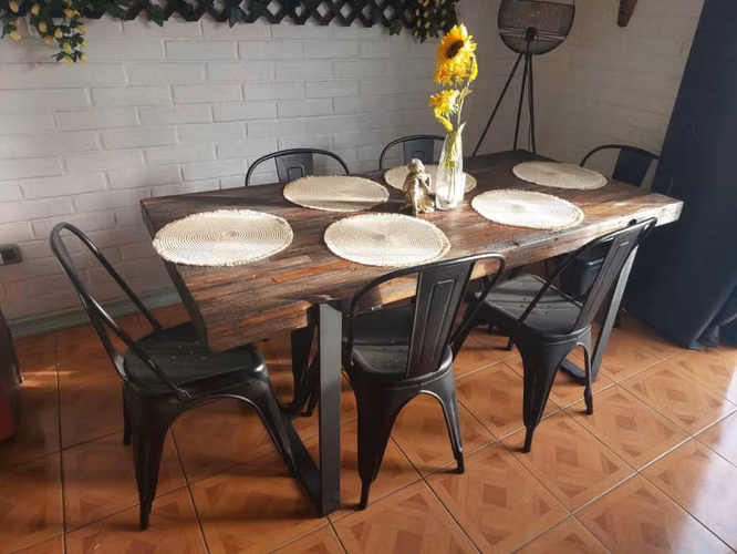 se vende comedor de Roble con fierro, más 6 sillas. solo 3 meses de uso. valor referencial en tienda $600.000.