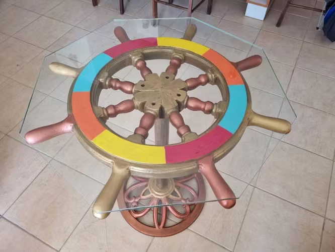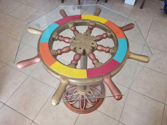 Hermosa mesa timón de madera con vidrio octagonal de 74 cm de diametro, base de fierro de 47 cm de diametro y altura total mesa 70 cm