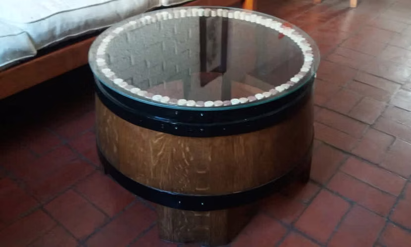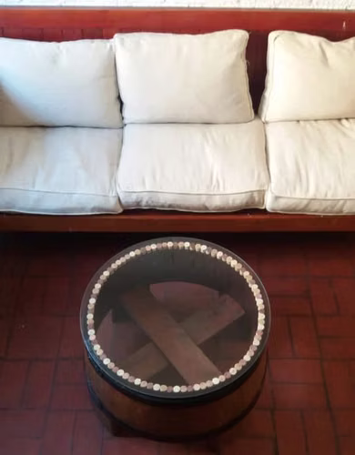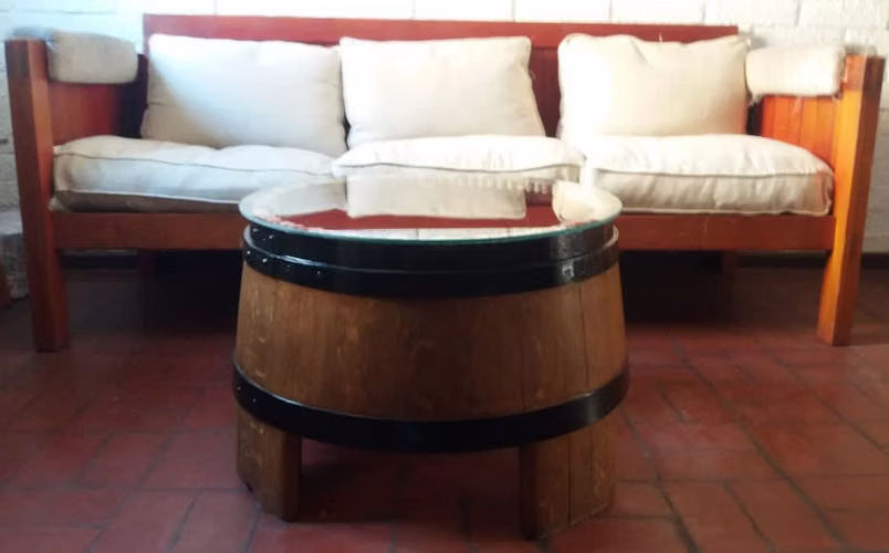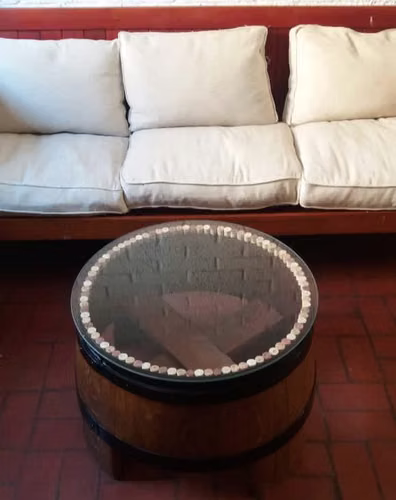 - Hermosa mesa de centro hecha en base a Barricas de Roble Francés, perfecta para interiores y exteriores techados, acabado único.