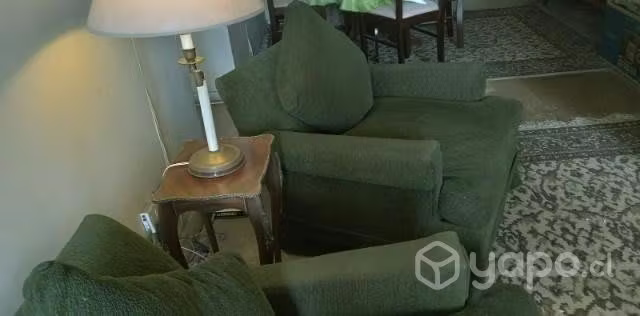 Juego de sofá y dos sillones rellenos de plumas. Tapiz y armado de madera en buenas condiciones a pesar de los 40 años de antigüedad. Cómodos, acogedores y han estado en la familia desde siempre.