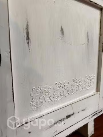 Hermoso velador rústico color blanco, con delicados tallados en relieve en los costados y una obra de arte en cerámica en la cubierta. Sus medidas son 60 x 48 x 35 cm (alto, ancho, fondo)