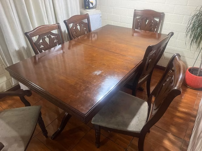Vendo comedor CIC Ascot con 6 sillas, 2 de ellas son sitiales. El comedor se puede extender a 8 posiciones. Se encuentra en buen estado, solo falta limpiar los tapices. La cubierta se encuentra bien, solo con rayas menores por el uso.