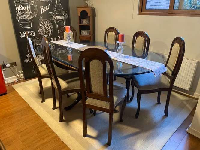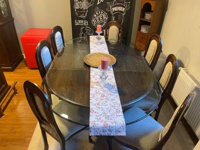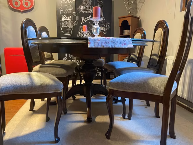 Comedor redondo u ovalado extendido de madera, ampliable para 10 personas. Tiene 7 sillas recién tapizadas. Excelente calidad.1.57 largo x 1.18 ancho.