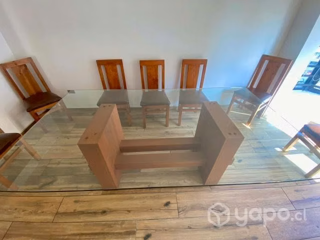 Comedor para 10 personas, con mesa en base de roble y cubierta de vidrio templado de 19mm.