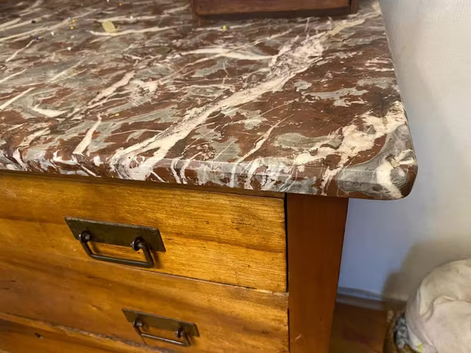 Cómoda antigua de madera y cubierta de mármol con espejo biselado