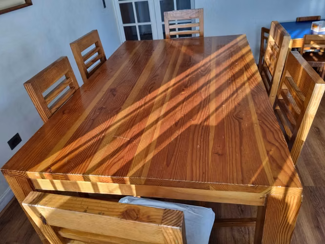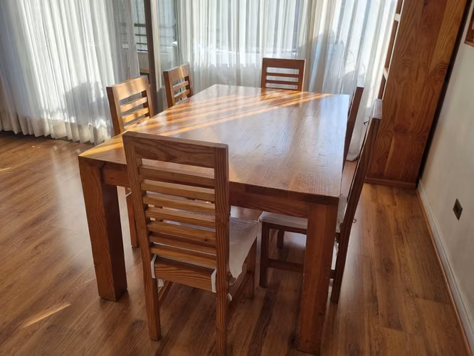 Comedor de Madera Maciza de Pino Oregón, proviende de vigas de antiguos rieles de tren. La mesa mide 1,10 X 1,70 X 1,10. Las 6 Sillas están tapizadas de Lino color Crudo.