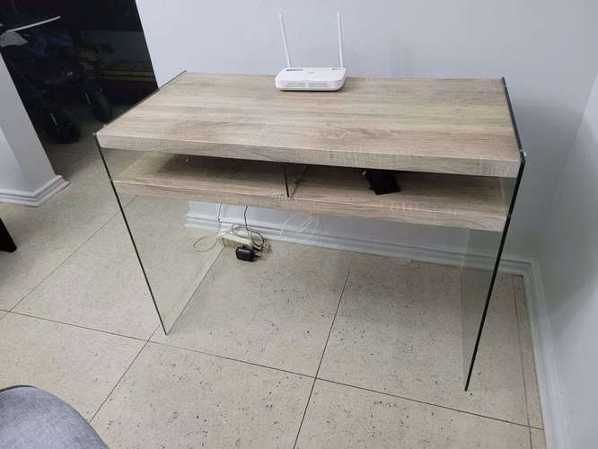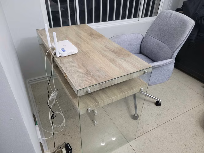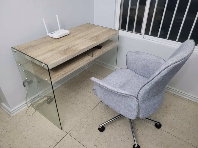 Se vende conjunto de escritorio moderno de vidrio y madera, y silla de escritorio gris. Ambos en buen estado.